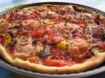 Etaler la pâte dans une tartière, disposer les légumes et la bûche de chèvre découpée en rondelles.