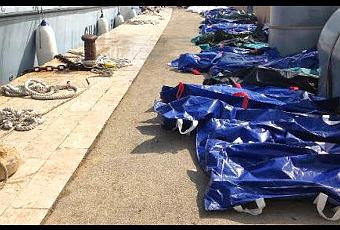 Photo fournie par l'agence de santé de Palerme montrant des corps de migrants alignés sur un quai du port de Lampedusa - Nino Randazzo / 3 oct. 2013