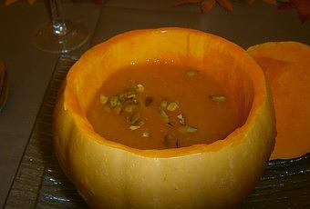 3) Mixer la soupe et la verser dans les potirons évidés.