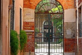 À travers la grille, et au delà de la corte, nous pouvons apercevoir une porte d'eau qui donne sur le rio de la Panada et sur le Palazzo Van Axel.