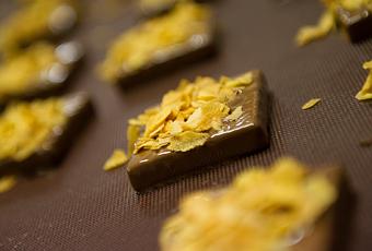 L’enrobage : l’intérieur du chocolat est enrobé de chocolat de couverture. Cet enrobage sert à conserver la forme et la consistance de l’intérieur et à embellir le chocolat d’une couverture lisse et brillante.