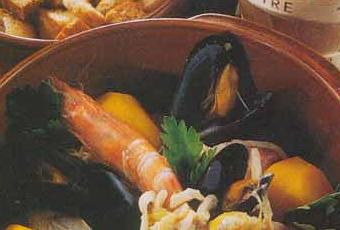 - Verser poissons et sauce dans un caquelon préchauffé. Un peu avant de servir, décorer le dessus de quelques moules et de langoustines. Saupoudrer d’herbes hachées. Servir les croûtons frits à part.