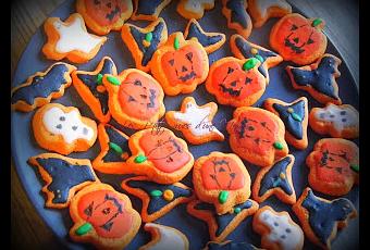Mélangez le blanc, le sucre et le jus de citron de façon à obtenir une pâte blanche semi-liquide.Pour les contour il est préférable qu'elle soit un peu plus épaisse.Divisez-la en autant de couleurs que nécessaire, ici 5.J'utilise un stylo à décor que l'on remplis avec le glaçage de son choix, mais une seringue toute simple est très bien aussi.Commencez par tracer les contours de vos formes, ensuite rajoutez un peu de citron pour détendre votre glaçage et faire le remplissage.Laissez sécher et pour les finitions utilisez soit un cure-dent pour les petits éléments, soit des feutres alimentaires pour les yeux des fantômes par exemple.