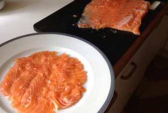 - A l’aide d’un tranche lard ou un couteau fin et souple, tailler de très fines tranches dans le saumon et les disposer sur 4 assiettes assez larges ( 30 cm ).