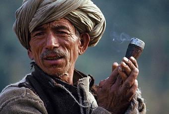 Mani Lal Gurung, with a bee resting on his cheek, takes a break in between honey harvesting. The Apis Labriosa is the largest bee in the world.