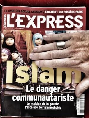 Nous nous attendions, ce 9 octobre 2013, à quelques preuves irréfutables de ce "nouveau" danger. Nous fûmes déçus. L'Express consacrait 12 pages (hors publicité), dont, évidemment, l'éditorial du patron de la direction. Christophe Barbier s'en explique: "l'Express ne peut se taire quand il voit se lever les tempêtes sur le pays, et celle-ci en est une une: dans un islam qui cherche encore sa place en France, dans une République qui ne sait pas bien intégrer ses citoyens musulmans, il y a un danger communautariste."Le dossier s'ouvre sur une photographie de ... 2004: "le 17 janvier 2004, quelques milliers de personnes manifestaient à Paris contre l'interdiction du foulard islamique dans les collèges et dans les lycées", dit la légende. A l'époque, le recteur de la Mosquée de Paris avait rappelé que ces manifestation n'avaient rassemblé que moins de 0,6% des Musulmans de France.