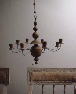 Allmoge: c'est l'art populaire de la Suède. Comme en France, nous trouvons dans cette catégorie toutes les formes d'art usuelles de fabrication non aristocratique, où la fonction et l'esthétique de l'objet sont les deux critères d'appréciation. lustre Allmoge: ce petit lustre est taillé dans un seul morceau de buis; le prestige du materiau, surtout dans les pays du nord où ce bois est très rare, renvoit au souci de valoriser un objet d'utilisation quotidienne. En effet, l'éclairage est très important si l'on se réfère aux longues périodes où l'obscurité due aux hautes latitudes est dominante.