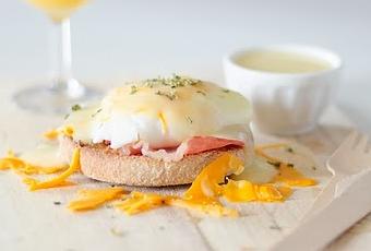 Réchauffer la sauce hollandaise. Ajouter une tranche de bacon sur le muffin, un œuf poché. Parsemer de copeaux de mimolette réalisés avec un économe. Verser un peu de sauce hollandaise, de la ciboulette.