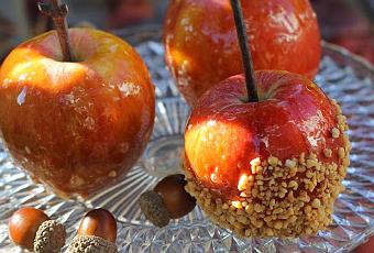 pour 4 personnes : 4 pommes acidulées 300 gr de sucre en poudre des fruits secs pour enrober les pommes ou graines de sésame