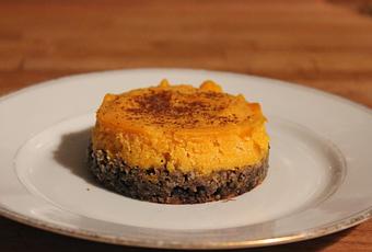 Préparer la garniture : Mixer soigneusement le tofu soyeux et l'incorporer à la purée de butternut. Ajouter la poudre de caroube, saler et mélanger à nouveau. Répartir la préparation dans les cercles.