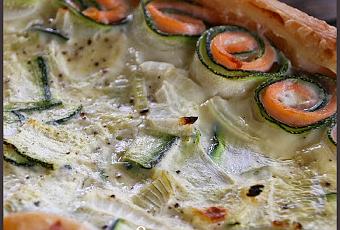 Ingrédients1 pâte feuilletée1 courgette1 gros oignon120gr de Saumon fumé2 oeufs
