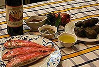 6 Rouget barbet 100/200 g , pomme de terre vitelotte 280 g, beurre 35 g, vinaigrette d’aromates 200g, Huile d’olive 100g, Sel, poivre, thym, laurier, 1/2 bouteille de Vin d’Irouléguy ( rouge ), paprika, 2 échalotes, sel de Guérande, poivre du moulin.
