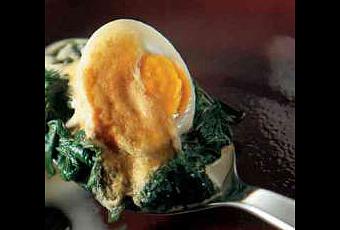 - Presser les épinards dans vos mains pour les essorer soigneusement. Les hacher grossièrement et les disposer dans un plat à four. Écaler les œufs et les couper en deux dans la longueur. Les placer sur les épinards, face coupée au-dessus. Saler, poivrer, napper de sauce. Passer le gratin quelques minutes sous le gril du four et servir aussitôt.