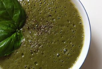 4. Mixer l’ensemble, rajouter les feuilles de basilic rincées et continuer à mixer finement.