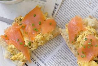 Cassez et fouettez vos oeufs dans un bol. Dans une poêle bien chaude, faites revenir un peu d’huile (ici, aromatisée au citron!) puis versez vos oeufs battus et remuez les tout le temps de la cuisson : il ne faut pas que ça accroche, nous ne faisons pas une omelette ! Salez, poivrez et réservez. Grillez vos tartines, ajoutez un peu de sauce sur la mie, disposez vos oeufs brouillés, votre saumon fumé et quelques branches de ciboulette ! A déguster chaud, avec un grand verre de lait :)