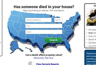 Qui souhaiterait vivre dans une maison où plusieurs personnes sont mortes dans d’atroces souffrances ? Personne évidemment et DiedInHouse l’a bien compris en créant un site internet dédié à la recherche d’un tel événement, aussi tragique qu’il soit, qui se serait déroulé dans votre (futur) maison. Afin de renforcer ces arguments de vente, le site a publié une étude menée par deux professeurs de l’Université de Wright (Fairborn, Ohio) qui montre que les maisons dans lesquelles un incident mortel a eu lieu mettent jusqu’à deux fois plus de temps à trouver un acheteur. De plus, si tel est le cas, vous pouvez marchander le prix de votre maison, une baisse allant de 15 à 35 % sur le prix initial est facilement négociable. Bref, vous l’aurez compris, les arguments sont nombreux mais le site ne garantit ni le fait de trouver de telles informations, ni leurs véracités.