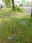 Quelques fleurettes bleues ou rouges noyées dans la masse d'herbes dites mauvaises, dans les folles avoines d'une grace infinie. Mais oui, du lin ! Du lin bleu, du lin rouge, en compagnie de quelques fleurs de soucis d'un orange éclatant. Cette petite jachère urbaine au milieu de toutes ces voitures coincées par les embouteillages vous met le coeur en joie même un lundi matin quand la semaine s'annonce chargée. Un joli lin dit ?
