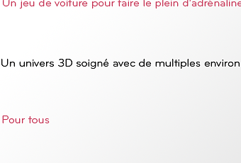 Avec ce jeu, vous allez pouvoir débloquer des voitures de plus en plus puissantes qui vous permettront de rafler tous les podiums ! De plus, vous évoluerez dans des environnements multiples, de jour comme de nuit, le tout dans un univers 3D soigné.