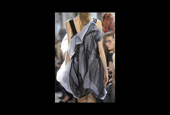 Noir et blanc en couleurs majeures, touches de bleu électrique ou de kaki foncé en couleurs subtiles, le tout en « color-bloc » sur des matières nobles comme la mousseline de soie et sur des jeux de transparence ou d’ajouré, donnaient un côté vaporeux et aérien tout en offrant une image sublimée de la femme de demain.