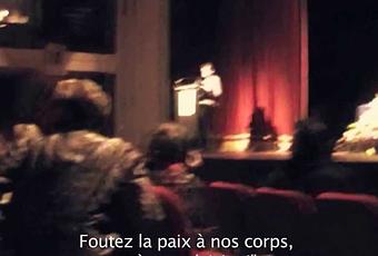 Tout d’abord, on ne s’est pas rué sur la scène. Ensuite, nous n’étions que 4-5 à entourer Christine Boutin, et plus ou moins le même nombre pour l’entartement de Monseigneur Léonard. Ce que vous voyez sur les images, ce sont les organisateurs et des personnes du public qui sont montés sur scène pour nous dégager. J’ai été rouée de coups et un type m’a tenu violemment et m’a tordu le bras. Il y a eu de nombreux appareils photographiques et des caméras qui ont été cassés. A un moment donné, dans le feu de l’action, je pensais que ça tournait en baston générale or notre but était surtout de ne commettre aucune violence, c’est pour cela que nous avions choisi des bisous et des caresses. Au début de la réunion, une personne sur la scène a déclaré que tout pouvait être dit dans cette salle car il n’y avait pas d’opposition. Lorsque notre chant féministe a démarré, ils se sont sentis assaillis. Je peux vous assurer qu’il n’y a au aucune violence de notre part, ce sont eux qui ont porté les coups.