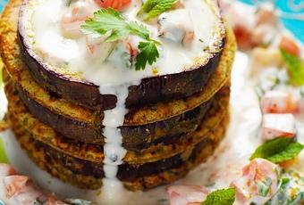 Dans une grande poêle chaude et légèrement huilée avec du ghee, versez des ronds de pâtes les uns à côté des autres afin d’obtenir des galettes rondes de la même taille que les rondelles d’aubergines. Cuire 3 minutes d’un côté et 1 minute de l’autre jusqu’à ce qu’elles soient bien dorées