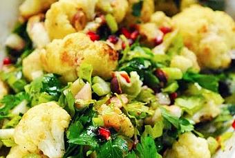 Du coup je remets ma petite pile d'une trentaine de livres, juste ce qu'il me fallait pour la nuit, sur la table et l'œil humide je les laisse seuls battant des pages en leur promettant qu'on se retrouvera demain…Et hier c'était Yotham Ottolenghi qui était encore sur le dessus de la pile comme depuis quelques jours mais rien n'y a quand même fait, mes meilleurs arguments et mon œil de biche conjugués ne sont pas venus à bout de la volonté de Marie qui est restée donc bien bien volontaire !Du coup je n'ai pas résisté à m'inspirer d'une autre des recettes de Jérusalem, le petit chef d'œuvre de Yotham Ottolenghi paru chez Hachette Cuisine.Salade de chou fleur à plein de choses !Ingrédients : 1 chou fleur – 3 ou 4 tiges de persil plat – 1 petite tige de céleri branche –3 ou 4 càs de graines de grenade – 3 ou 4 càs de noisettes entières – ¼ de pomme bien acidulée - 1càs de miel liquide - huile d'olive – vinaigre de Jerez - sel et poivre