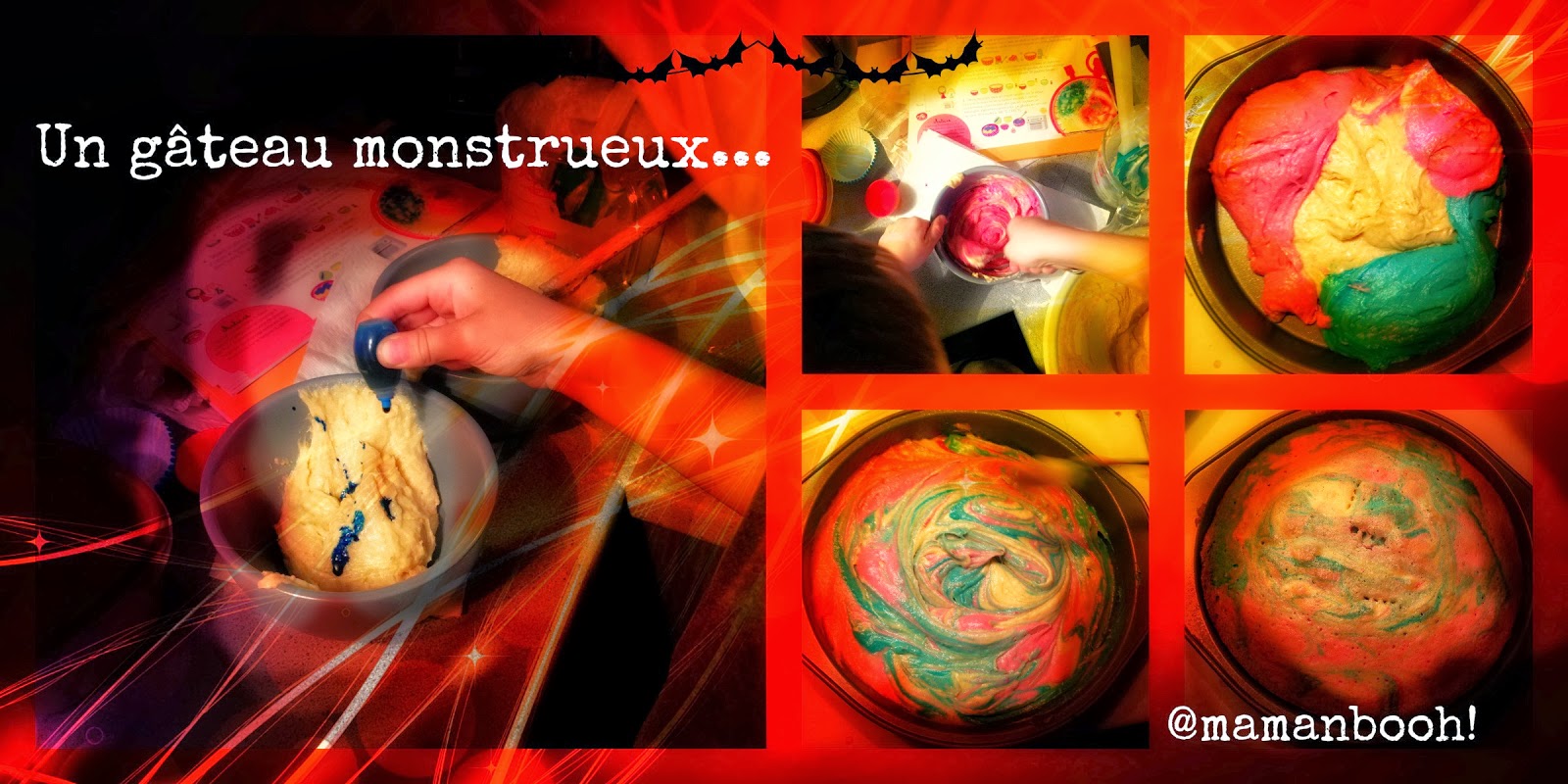 Moi qui rêvais de faire des trucs vraiment dégueu, laids et qui font peur, je me suis résignée à ne faire qu'un gâteau. Nous avons regroupé les ingrédients et hop! On s'est mis au travail. En fait, c'est vraiment simple, on fait une recette de gâteau blanc ou on prend tout simplement un mélange de gâteau des anges Betty Crocker blanc qu'on divise dans trois plats et on ajoute 20 gouttes de colorant alimentaire dans chaque partie qu'on mélange ensuite ensemble directement dans la moule avant de le mettre au four.