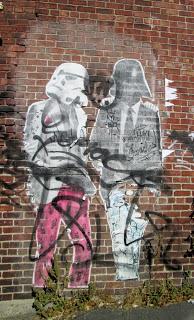 Dans la série des oeuvres éphémères (plusieurs des images montrées sur ce blogue dans la catégorie des murales urbaines ne sont déjà plus visibles sur le terrain), on notera cet amusant amalgame de Star Wars et graffiti du milieu de la mode.