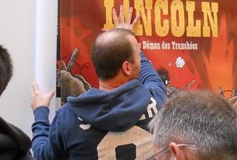 Alors que les premiers festivaliers avaient déjà fait leur entrée au Quai St Malo, certains éditeurs mettaient encore la dernière main à leur stand. C’était en particulier le cas par les éditions Paquet, dont la déco a eu lieu en direct et sans filet. Tout le monde était sur le pont, et Pierre Paquet lui-même (de dos sur la photo) a su mouiller la chemise et montrer qui était le capitaine. Hissez haut, moussaillon !
