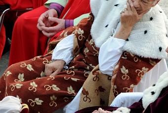 Des gens bizarres costumés de rouge, de bleu, de jaune, de noir, coiffés d'étranges galurins, vêtures d’un autre temps, cérémonie ou rituel pour je ne sais quelle divinité. Je vois un roi et une reine. Sont-ils les souverains des Jardins de la Fontaine ? On ne m’aurait rien dit…