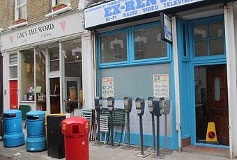 Et voilà il viennent de passer la semaine à littéralement transformer la rue en années 80′s. Les boutiques ont été repeintes en couleurs vives et carrément transformées en différents lieux: librairie gay (Gay’s The World) où le coeur de l’action (parmi les scènes tournées à Londres) sera filmé, tailleur, barbier/coiffeur (…), une vieille cabine de téléphone, des vieux parcmètres…Bref, je voulais partager avec les lecteurs de Voilà Londres, c’est assez insolite de voir un tournage de film en plein Londres, alors que d’habitude les films se filment à Pinewood Studios.