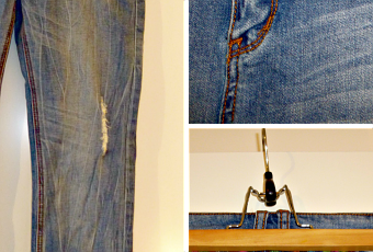 Coloris : incrustations ikat poches et autour de la taille, sur fond jean bleu clair used