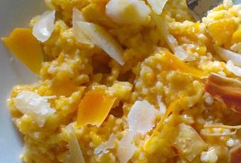 Avec toutes les citrouilles, potirons, butternut & Co que j’ai ramenés du Gers, ou que mes voisins m’ont donnés, j’ai de quoi cuisiner pendant ….. pas mal de temps ! Pour ne pas nous lasser des recettes à base de courges, j’essaie toujours de varier les plats salés et sucrés. Les veloutés sont nos préférés avec la purée. Mais en dehors de ces classiques, il y a tant de façons différentes d’accommoder ces fruits (oui, les courges sont des fruits comme la tomate, le concombre…), bon disons, ce légume-fruit. Le risotto en est une. Et c’est délicieux. Suivant les quantités, vous pouvez le servir en accompagnement d’un plat de viande, il est délicieux avec du poulet, ou en plat principal, le soir par exemple. Je l’ai servi avec de fines tranches de jambon sec et agrémenté de copeaux de parmesan et de mimolette, pour le goût et la couleur.
