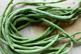 Lavez et laissez sécher les haricots longs. Équeutez-les. Lavez bien la planche à découper et le couteau.
