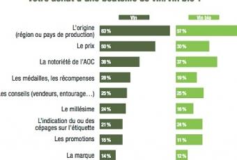 L'étude montre par ailleurs qu'un Français sur trois consomme ou a déjà consommé des vins bio. Le chiffre d'affaires des vins bio s'est ainsi élevé en 2012 à 413 millions d'euros (+15 % en un an), contre 249 millions d'euros en 2007. Les régions françaises les plus engagées dans la viticulture bio sont respectivement le Languedoc-Roussillon , la Provence-Alpes-Côte-d'Azur et l'Aquitaine.