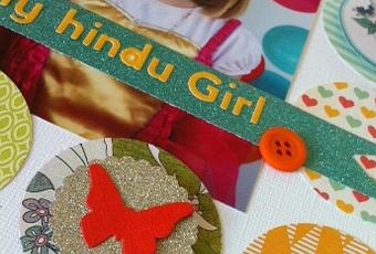 Pas facile comme sujet!!! mais je me suis vraiment amusée à faire cette page!! voici une photo de ma fille déguisée en princesse Hindouiste. J'ai donc repris le combo du drapeau de l'Inde (safran/vert), mon titre est en anglais car c'est la 2ème langue officielle du pays après l'hindri (euh et puis surtout que le titre en hindri pas facile!!!!), quelques paillettes pour le coté bollywood (nom donné à l’industrie du cinéma située à Bombay) ainsi que des ronds pour le "bindi" qui est la marque située entre les sourcils à l’endroit du 6ème chakra, c'est le 3ème oeil de Chiva...ouf!!!!!