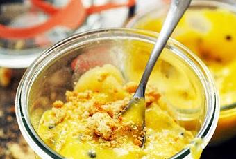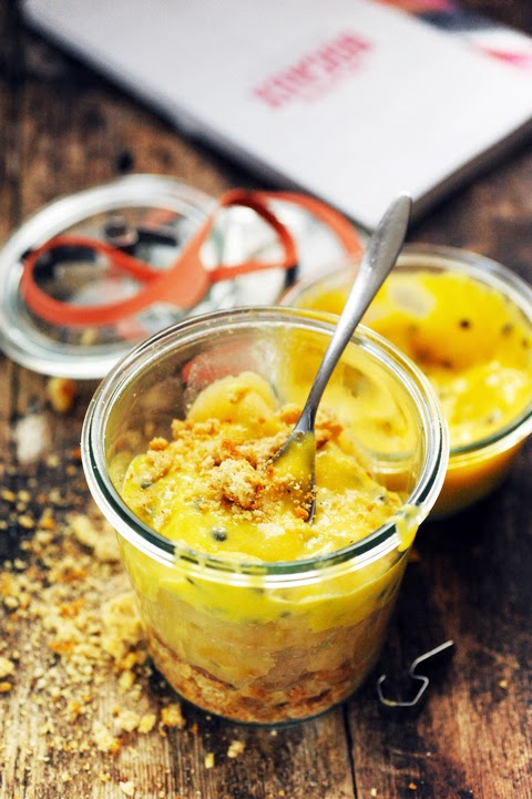 Et ces deux sortes de confitures peuplent encore les placards de ma belle-mère bien après son départ… Et même si je les mange rarement je les regarde avec un poil d'émotion parce qu'ils me la rappellent, elle et sa bien étrange cuisine…Les conserves en bocaux ressemblent pour beaucoup à ça des étranges souvenirs que l'on regarde plus que l'on ne se jette dessus pour les dévorer !Et puis l'autre jour j'ai reçu Bocaux d'Henrik Andersonparu aux éditions Kéribus, un éditeur que je vais sans doute adorer vu ses productions ! Je vous en reparle très vite avec l'ouvrage de Stéphane Jégo A peine cru, un ouvrage à dévorer ! Je reçois donc Bocaux et je commence à feuilleter l'ouvrage avec donc l'idée que les bocaux sont des trucs que l'on met sur une étagère et que l'on regarde de temps en temps en se disant qu'on les ouvrira peut-être un autre jour…Et là je commence à feuilleter et je découvre d'abord qui est Henrik Anderson et puis le pourquoi et le comment des bocaux, j'attrape au vol plein de trucs et d'astuces qui commencent à me faire penser que le bocal… Et puis je découvre les recettes d'Henrik Anderson, mais aussi les photos de Pierre Javelle et les textes de Pauline Ricard-André et là franchement c'est l'explosion, c'est frais, c'est beau, c'est appétissant ! Et surtout surtout ça ne donne pas envie de poser le bocal sur une étagère mais de le dévorer sans attendre ! Alors forcément si vous attendez une Xème recette de confiture aux fraises ou comment conserver les légumes du jardin à l'eau, passez vite votre chemin vous ne trouverez rien de tout ça.Ici les champignons se parfument aux herbes, les sardines se colorent aux œufs de saumon et la courge s'accoquine avec la vanille… Couleurs et parfums sont de rigueur ! Alors si vous chercher un livre pour vous rénover le bocal, n'hésitez pas Bocaux d'Henrik Anderson est un véritable coup de fraîcheur !Bocal croustifondant et aciduléIngrédients : Pour le curd acidulé : 3 fruits de la passion – 6cl de citron vert et le zeste d' ½ citron vert – 60g sucre en poudre –30g de beurre pommade – 2œufs Pour la compote de pommes : 4 petites pommes – 2càs de sucre en poudre – 10cl d'eau – 20g de beurre Pour faire croustiller : 4 biscuits du type palets bretons