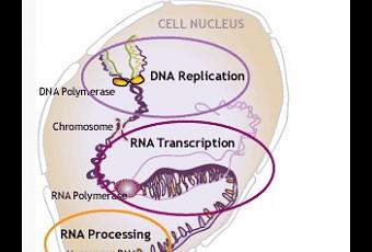 La fabrication des protéines comporte 2 étapes principales : Lors de la première étape, la transcription, l’information contenue dans l’ADN stockée et protégée dans le centre de la cellule est copiée dans un ARN messager (ARNm) – cette copie est ensuite déplacée à l’endroit où elle est nécessaire dans la cellule. Dans la deuxième étape, appelée traduction, l’ARNm est utilisé comme un modèle de l’information génétique et est décrypté par de petites machines appelées ribosomes, qui décodent la séquence d’ARNm et assemblent les bons acides aminés pour former la protéine.