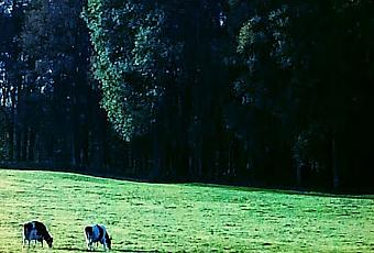 La lumière est d'une qualité exceptionnelle ce matin. Elle éclaire superbement les couleurs automnales de la forêt domainiale. Un peu plus loin, je traverse une zone de près. L'harmonie est parfaite. Les haies, les arbres, les vaches et les chevaux, le ciel encore brumeux à gauche, côté soleil, qui permet une lueur tout à fait spéciale, et déjà tout bleu à droite, tout contribue à me faire aimer ce décor.
