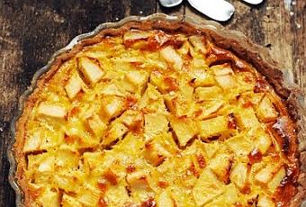 Un mois pendant lequel Pascale proposait une recette de Crumble exotique et Anne un Gratin de légumes. Le mois de septembre s'éloigne est déjà loin mais je me suis dit qu'il serait dommage d'oublier cette jolie tarte en attendant que je vous parle d'octobre…Tarte aux pommes à l'AlsacienneIngrédients :Pour la pâte : 180g de farine - 60g de Fleur de maïs Maïzena - 1 pincée de sel - 120g de beurre – 90g de sucre en poudre roux - 1 œuf et 1 jaunePour la garniture : 3ou 4 pommes acidulées - 2 œufs - 20 g de sucre en poudre roux - 1 càs de Fleur de maïs Maïzena - 20 cl de crème liquide entière – 1càs de praliné en poudre
