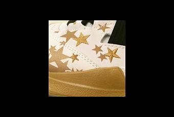 Le modèle de Carmelo Anthony a un upper en cuir blanc doté de 3M réfléchissant et d’étoiles dorées imprimées et brodées, contrasté par du noir et complété par une semelle translucide à paillettes.