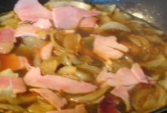 faire revenir les oignons et l,ail et le jambon dans une cuillére d,huile olive.