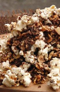 Ingrédients : 1 sachet de pop corn à faire au micro-onde – 100g de chocolat aux noisettes râpé en copeaux – 100g de noisettes entières émincées – 4càc de sucre en poudre – quelques pincées de piment en poudre