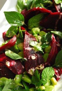 Posez les pousses d'épinard sur un plat de service, utilisez un plat assez grand pour ne pas être obligé de trop tasser cette salade. Ensuite alternez des herbes, la betterave, des herbes, les fèves et quelques herbes pour finir. Versez la sauce, mélangez seulement au moment de servir.