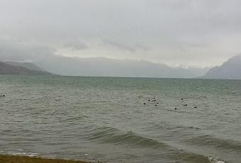 La pluie tombe sans arrêt et ce n'est tout de même pas de l'eau chaude qui minonde. J'avance. Plutôt vite. Mécaniquement, frappant du sol mes bâtons comme un robot. Sans penser à rien de très précis. Je regarde tout de même de temps en temps le lac, sa surface toujours troublée par le vent.