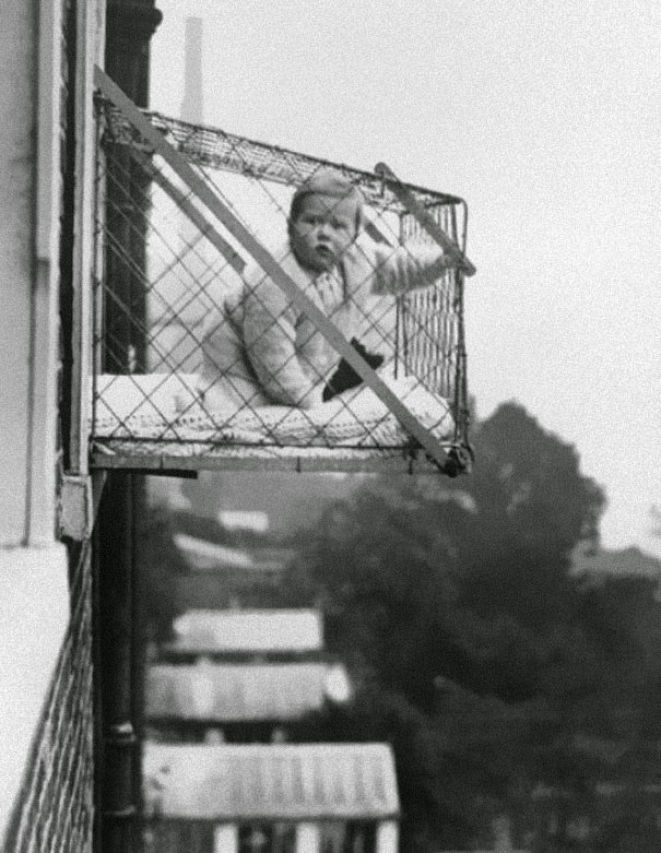 8| Cage pour bébés utilisée pour s'assurer que les enfants reçoivent assez de lumière et d'air frais quand ils vivent dans des appartements pendant la guerre (1937)