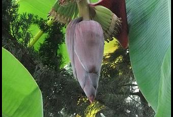 Lorsque le bananier a produit entre 25 et 30 feuilles, (au bout de sept mois environ), au cœur de celles-ci se développe un bourgeon floral évoluant en une inflorescence qui retombe sur le côté.