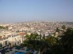 Là, c'est la vue de notre chambre d'hôtel. En bas, la piscine. Au loin, la médina, qui est aussi la plus grande médina du monde. Elle est habitée. Parmi les artisans, c'est le paradis des brodeuses et des tanneurs. Mais pour les achats, évitez. Ce n'est pas bon marché.