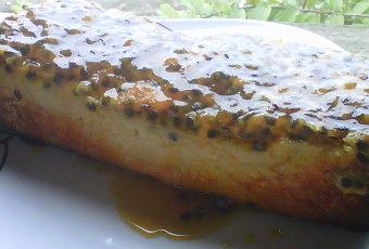 7- Pendant ce temps, vider les fruits de la passion, et mettre leur contenu dans une casserole. Ajouter 2 bonnes cuillers à soupe de sucre de canne et faire bouillir.
