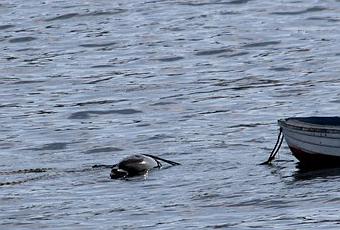 Lorsque nous l’avons aperçu, il semblait se prélasser, immobile, appuyé sur le cordage reliant cette barque à sa bouée.